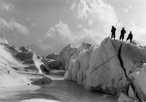 1956年Fritz Müller率领的珠峰探险队成员由瑞士人和夏尔巴人组成。图为队员们在冰瀑区支起帐篷稍作休整。尼泊尔于1950年对国外探险队敞开大门。第一座被测量的山脉是高达8,091米的Annapurna山。1953年8,850 米的珠穆朗玛峰在科学家的测量下成为世界第一高峰。
