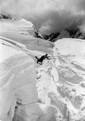 该图于1956年拍摄于尼泊尔的坤布。团队中一位夏尔巴成员攀爬时唯一的安全措施即一条打了结的绳子。该图的重要意义在于,它展示了当年探险队依靠并不先进的器械,技术和方法征服了世界第一高峰。