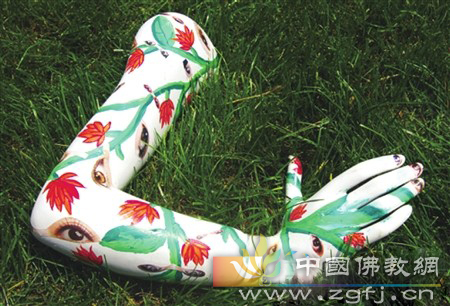 白色的模特,绿藤红花如脉络般缠绕着身体和四肢,蓝黄的热带鱼象征血液的游动。一截断臂上,数双明亮的黑眼睛炯炯有神地望着。空白处上百个清晰的人头像穿梭其中,“五彩基金”的赵静老师说:“这就是同学们理解的新生命。”