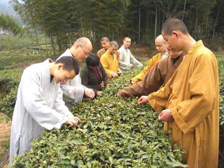 佛教传入我国初期,僧人也是随师乞食或靠俗人供给生活所需。西晋惠帝建兴圣寺“供养百僧”。北魏有“僧祗户”(凡民间每年捐谷六十斛入僧曹的,称之),但我国僧尼多居寺庙,过着集体生活,要念经坐禅,乞食似不可能。随着时间的推移,佛教为了在我国广袤的土地上扎根和不断发展,必须与我国的儒教、道教相融合,以适合中国的国情,形成具有民族特色的宗教体系。早在东晋时,佛教就开始自力更生地解决生存问题,南朝梁《高僧传》记载,东晋时高僧道安“赍经入田,因息就览”,佐证已废除印度佛教的乞食制,开始生产劳动了。他们种茶的历史也很悠久,相传晋代名僧慧远曾在庐山东林寺以自种自制的茶招待挚友陶渊明,“话茶吟诗,叙事谈经,通宵达旦。”