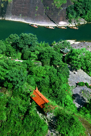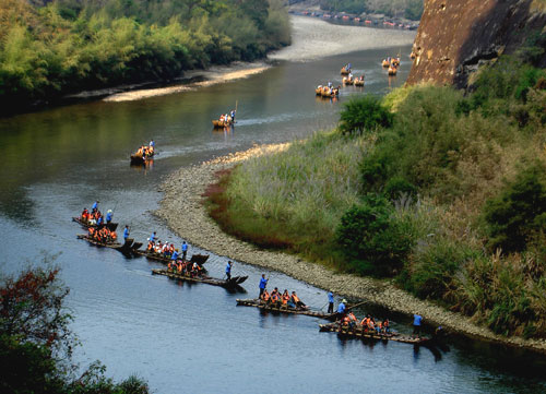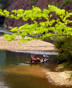 “一溪贯全山,两岸列仙岫”,当你乘古朴的竹筏荡入弯弯碧水之中,抬头可望山景,俯首能见鱼翔,侧耳可听溪声,垂手即触清流。丹山碧水结合得如此天衣无缝、完美无暇,不得不令人感受到大自然的造化的神奇。