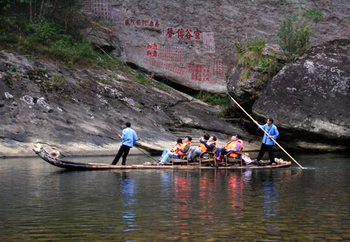 当您乘坐竹筏沿九曲溪顺流而下,湍流中浪击飞舟,深潭里凌波轻筏,一路水程逍遥浩荡。掩于青山丹崖中的九曲溪,虽水路弯弯却有惊无险,让你感到舟行碧波上,人在画中游,动中有静,静中有动。生发出见仁见智、亦真亦幻的游兴。观赏仙岩怪石,感悟千年文化,自然与文化浑然天成、历史与时尚和谐交融,无不感到轻松与惬意,进入物我两忘、天人合一的境界,身心与武夷山水融为一体。