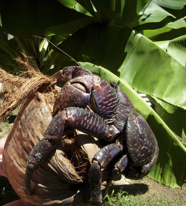 椰子蟹属于寄居蟹类,但已经演化成为不需要背着贝壳活动。由于体型硕大,行动迟缓,再加上人类很容易到达它们的栖息地,因此常常成为人类捕食的对象。