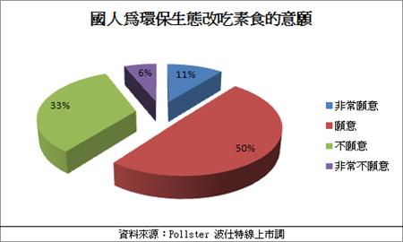 那么为了地球未来的环境着想,有多少人会愿意因此改变日常的饮食习惯改为吃素呢?波仕特线上市调网(http://www.pollster.com.tw)在6/30针对「您愿意为了维护地球环保生态而改吃素吗?」进行网路民调,结果显示有10.78%表示「非常愿意」,有49.67%表示「愿意」,两者共占60.45%;「不愿意」者占了33.33%,「非常不愿意」则有6.22%的比例,结果看来多数的受访者愿意为环保而改吃素,证实了环保意识的确深入到每一位民众的心中。