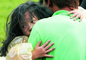 在南台湾重灾区,一名获救的小女孩面容憔悴,神情惊恐。