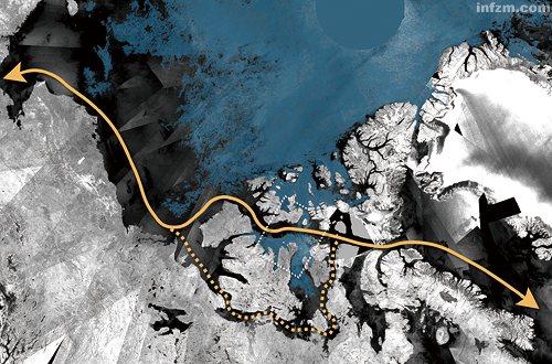 西北航道是一条穿越加拿大北极群岛,连接大西洋和太平洋的航道,一路上冰雪覆盖,艰难险阻,当年阿蒙森和他的船员被困在北极长达两个漆黑、寒冷的冬天才得以勉强穿行。在那之后的100年间,除了破冰船能够偶尔突破封锁以外,几乎再没有普通船只往来于此。然而,2007年夏末,北极海冰的大面积消失使原先冰封的航道彻底融化,甚至普通的海船也能够轻松通行,人们梦寐以求的航道终于第一次在世人面前展露尊容。