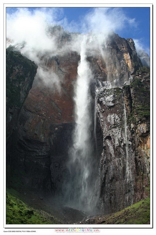 一道高近千米的洪流如银链如飞虹,在高山峭壁之间凌空直泻,通体仿佛笼着一层轻纱,在阳光的照射下,可以看到一道美丽的彩虹悬挂在柔美的水雾上。飞流落下,激得满山谷一片珠飞玉溅,隆隆的水声,仿佛一千口大钟互相撞击。瀑布周围高山环绕,嶙峋的山崖藤缠葛绕,古木参天,壮丽之外又添几分肃穆之美。这个地区的热带雨林非常茂密,不可能步行抵达瀑布的底部。雨季时,河流因多雨而变深,人们可以乘船进入。在一年的其它时间里,只能从空中观赏瀑布。