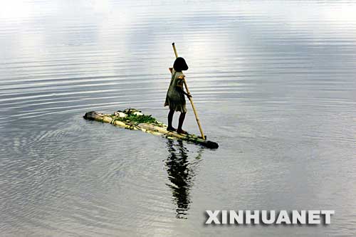 这是2004年7月29日,在距印度东北部城市高哈蒂35公里的萨马塔地区,一名女孩在被洪水淹没的地区撑木筏。