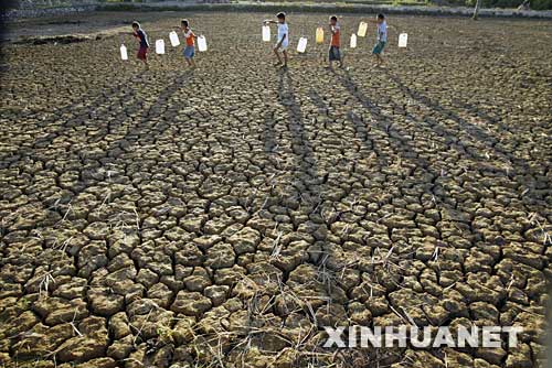 这是2007年8月31日,在印度尼西亚南苏拉威西省,几名男孩挑着生活用水,从干涸的土地上走过。