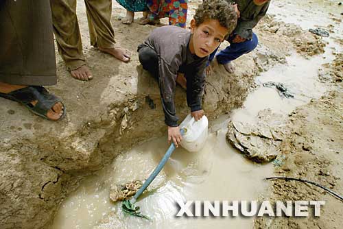 这是2003年4月22日,在伊拉克南部城市巴士拉郊区,一名小男孩用水管灌水。战争造成伊境内水源短缺和水源污染,导致水危机。