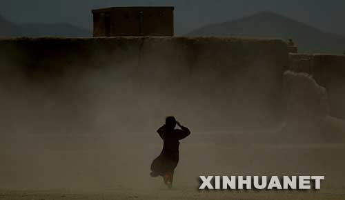 这是2003年6月15日,在阿富汗首都喀布尔,一名牧羊女在沙尘暴中寻找走失的羊。