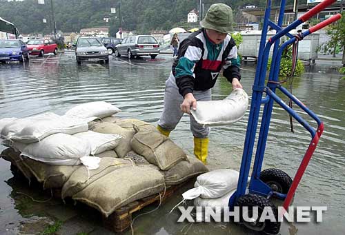 这是2002年8月7日,一名男孩在德国帕绍搬运沙袋,准备用来阻挡洪水进入多瑙河岸边的房屋。