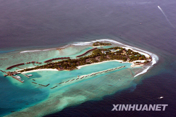 这是9月7日在马尔代夫上空拍摄到的一个旅游岛。位于印度洋中的南亚岛国马尔代夫,1200个岛屿的平均海拔只有1.5米。一批科学家发布的最新报告表明,如果目前全球变暖的趋势得不到遏制,那么马尔代夫和其他一些地势低洼的国家可能会在本世纪消失。马尔代夫总统纳希德表示,马尔代夫将尽力避免这种情况出现,但在最坏的情况下,马尔代夫可能会举国搬迁。新华社记者陈占杰摄