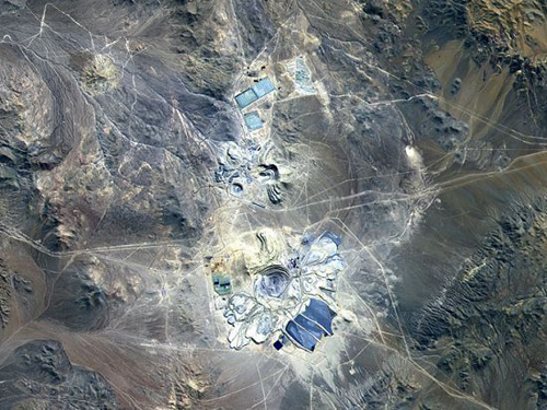 卡纳内铜矿位于以南25英里的美国边境墨西哥索诺拉州。右上角目前仍在开采的科罗拉多矿坑跨度为1.6英里。它是世界上最大的铜生产商之一,同时也生产黄金。在热岩浆侵入上层基岩处,这两种金属往往同时存在。热流在岩石周围循环并侵入岩石的裂缝,岩浆结晶改变岩层成分形成富铜矿和金矿。