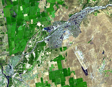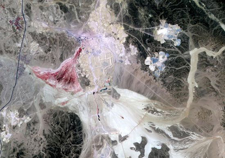 该图片由美国太空总署的Terra卫星搭载的高级星载热辐射和反射辐射计于2005年9月17日拍摄。这是一个可见光和红外图像彩色融合成的虚拟图。红色的是植被,蓝色的是水域,从浅黄色到黑色渐变的是岩石和土壤。图片下部中间靠左的条纹区域是采矿作业区。