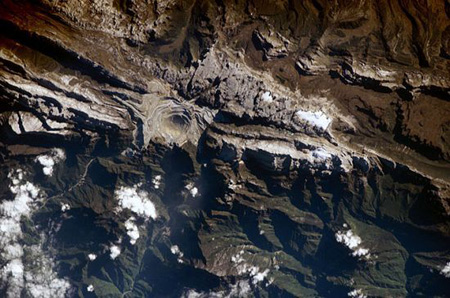 位于秘鲁南部安第斯山脉的托克帕拉矿宽1.5英里,深2300英尺。该矿主要出产铜,但它也出产金,银和钼。环绕着峡谷中心蜿蜒的铁路将开采出来的矿石运送到矿井西南方60英里以外的海岸。该图片由宇航员于2003年9月22日在国际空间站上拍摄。