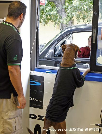 当地时间2009年11月24日,美国佛罗里达州,BP加油站便利店里的小狗Cody在窗口问候顾客,Cody身穿制服,戴着自己的工作证(名片),对顾客非常友好。