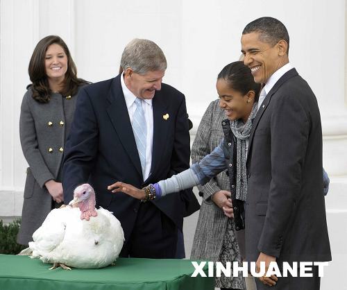 11月25日是感恩节的前一天,美国总统奥巴马(右一)和女儿玛莉娅(右二)一起在首都华盛顿白宫出席赦免火鸡仪式。