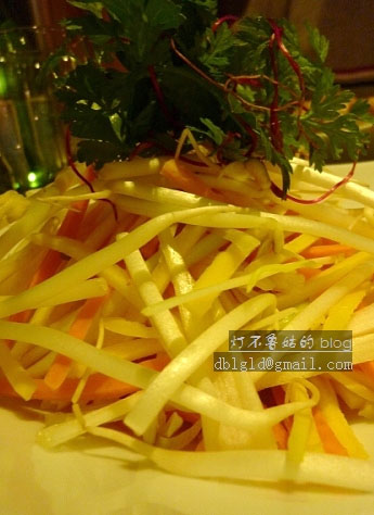这两个菜真是一天堂一地狱。那个蘑菇主题的前菜精致无比,顶级美味;但主菜以豆芽为主,大葱为辅,胡萝卜穿插其中,跟了油醋汁让我自行生拌之。就是大盘沙拉。