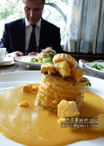 主菜是领班和厨师商量后定的:这家菜牌上素食只有披萨和意粉,结果上来一个很亲切的东西。主菜类似我们的炒菜,只是多一点牛油香,少了一点清爽;那个作为“配饭”上的蜜汁板栗做得很精致,糯绵香甜,十分可喜。