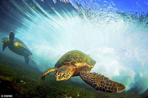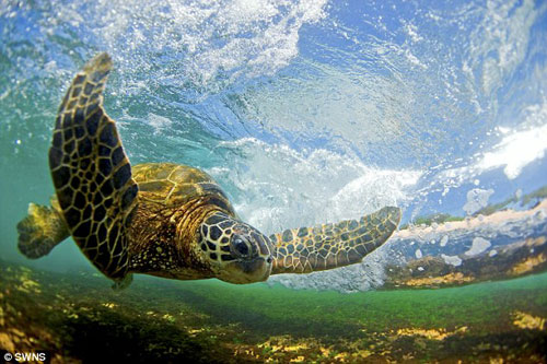 在夏威夷Laniakea海滩上,绿海龟几乎每天都做同样的事情,它们吃着海藻,享受休息时光。今年40岁的李特先生说,“海龟们喜欢穿过波浪,并在波浪下面游泳”。
