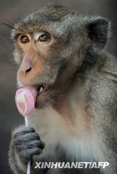 11月29日,在泰国首都曼谷以北150公里处的一座古寺前,一只猴子享用专为它们准备的棒棒糖。