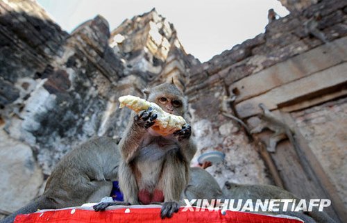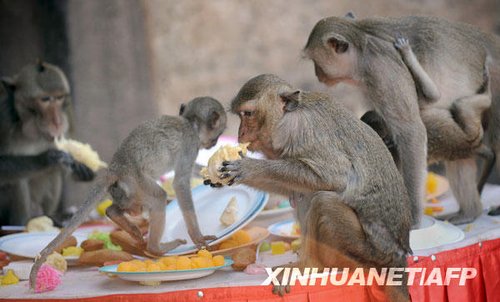 11月29日,在泰国首都曼谷以北150公里处的一座古寺前,几只猴子享用专为它们准备的水果大餐。当天,这里举行一年一度的“猴子宴会”,4000多公斤的蔬果让猴子们一饱口福。