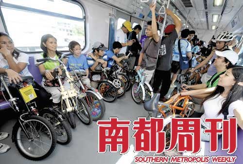 2009年11月8日,菲律宾马尼拉,人们随身携带自行车乘坐地铁。