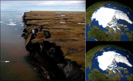 当季节发生变化时,会引起冰帽融化和再生,但是永久冻结带的侵蚀持续时间更长。由于全球变暖导致岸边富含沉淀物的冻土融化,海水更容易侵蚀海岸和陆地,北极地区的海岸线正处于危险之中。图片上是,美国阿拉斯加州东北部的波弗特海岸受到气候变化影响。