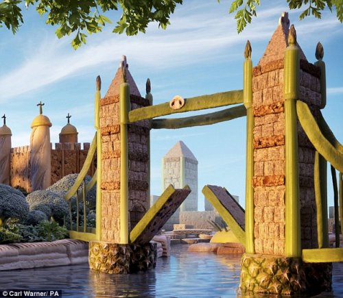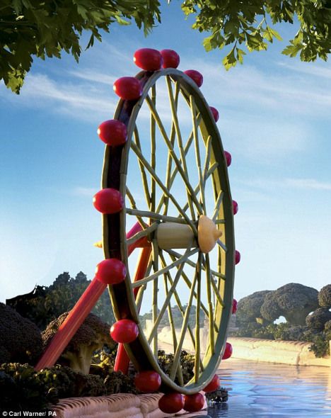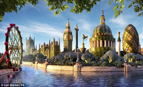 除此以外,伦敦的其他标志性建筑也用蔬菜复制出来,例如伦敦眼是用青豆做辐条,并用小番茄雕刻成吊舱。在制作泰晤士河旁边的灯柱时,模型师把洋葱放入香草荚里充当灯泡,用芦笋当灯柱,并用马鲛鱼制成装饰华美的鱼形底座。圣保罗大教堂的塔尖用胡萝卜、黄色和绿色小胡瓜及青蒜制成。