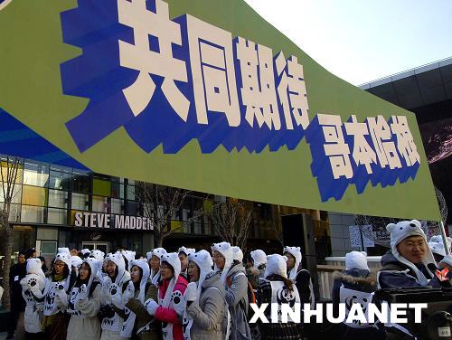 共同期待哥本哈根。12月2日,头戴北极熊帽子的志愿者在活动现场呼吁公众关注气候变暖。当日,世界自然基金会在北京举行以“共同期待哥本哈根”为主题的环保宣传活动,呼吁世界各国的民众行动起来,加入低碳一族,应对气候变化。
