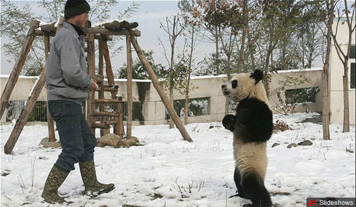 雪后卧龙,熊猫仔仔在嬉戏玩耍