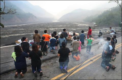 甲仙乡公所8月15日举办头七法会,罹难者家属回到面目全非的小林村跪拜(来源:新华网)