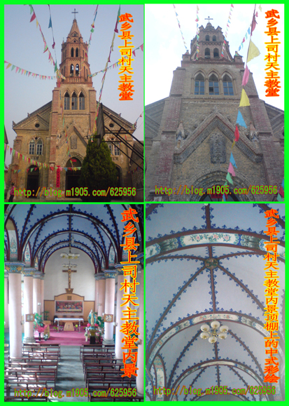 在武乡的教堂所在地有:总堂;上司乡上司村外哥特式内罗马式高29米、上司乡小店村2005年重建新式、蟠龙镇白家庄村、监漳镇姚家庄村、洪水镇小麻角村以及狼卧沟村等地,在礼拜天(主日)善男信女们隋着宗教礼仪和唱诗班进行虔诚地祈祷,隋时会有西式的婚配圣礼在教堂举行……