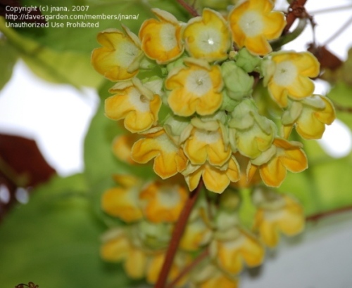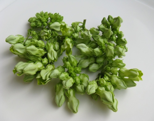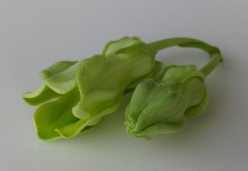 我不知道这花中国有没有,是不是也拿来吃,我也不知道具体它的中文名是什么,在超市里买的,包装袋上显示它的英文名为Cowslip creeper, 有人说是“夜来香”,显然这不是我们普通常见的那种夜来香,如果单是Cowslip 可以翻译成“黄花九轮草”,在网上查了一下这种花还有另外三种英文名字:
