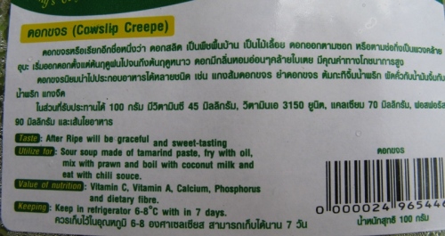 包装袋上说明这种花泰国人拿来做酸辣汤或清炒,此花含有维他命C.A.钙、磷和纤维(包装上的名称:Creepe最后漏了一个字母r)