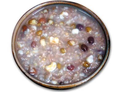 做法二:主料:小米、玉米、黄豆、绿豆、红豆各2汤匙;配料:碎猪肉约100克,莲子、栗子数粒,盐少许。