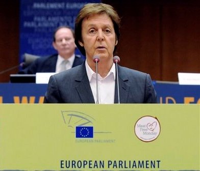 保罗·麦卡尼把他的“周一无肉日”活动做到周四的欧盟议会上了。他说,遏止全球变暖的个人力量与政府的力量一样大。