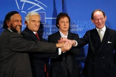 从左至右:IPCC主席帕乔里、欧盟议会主席 Jerzy Buzek、保罗·麦卡尼、欧盟议会副主席爱德华·麦克米兰-史考特(Edward McMillan-Scott)在布鲁塞尔周四的(2009年12月3日)欧盟议会上。(