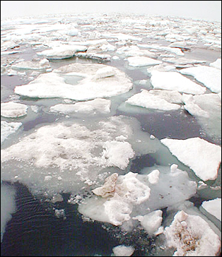 海冰的融化还不仅仅表现在面积的缩小上。据最新的科学观测表明,北冰洋上的北极冰盖厚度已经从原来的3米减少为1.5米,而且超过70%的冰层都是冬季刚刚结成的新冰。在夏天的时候,海冰即便不全部消融,也已经是所剩无几。
