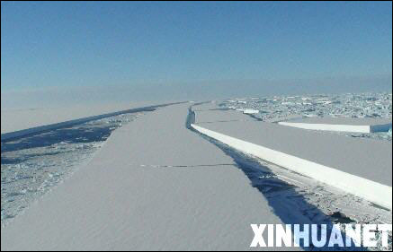 这是2008年3月25日英国南极考察处发布的南极冰架上一处冰块裂隙的资料照片。科学家借助卫星图像证实,南极威尔金斯冰架边缘的一块巨大冰川逐渐断裂入海。这块冰川面积约415平方公里,已形成数百年至1500年,2008年2月28日起出现融化和从冰架崩离的迹象。科学家警告说,这一罕见现象是全球气候变暖的结果。