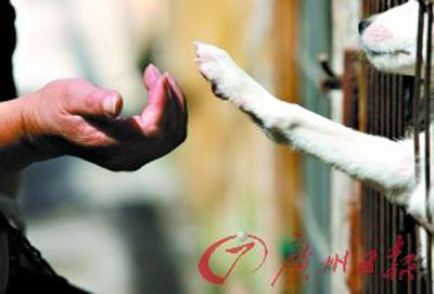 在智利首都圣地亚哥的防止虐待动物协会,一只小狗从笼中伸出爪子与人“握手”。
