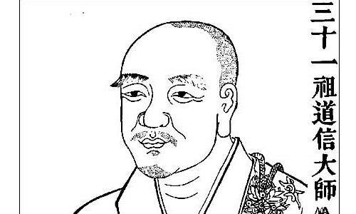 道信(580—651)俗姓司马,原籍是河内(治所在今河南省沁阳县),后来迁移到蕲州(治所在今湖北省蕲州镇)。七岁出家,其师的戒行不纯,他便秘密地受持斋戒,不为人所知。五年后(592),即他十三岁的时候(依《佛祖历代通载》为开皇十二年),往舒州皖公山(治所在今安徽省潜山西北)跟随三祖僧璨禅师,学习禅法。经八九年(《续高僧传》说是十年,《佛祖历代通载》卷十说“服劳九载”),僧璨禅师往罗浮,道信想随去,没有得到师父的批准。僧璨对他说:“汝住,当大弘益。”这预示他留下来,将有很大的成就。