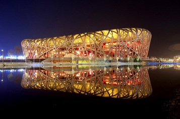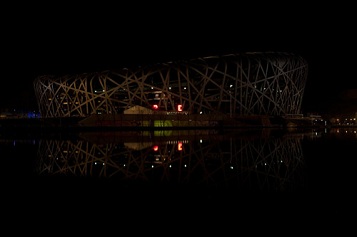 2009年3月28日。晚上 8点30分,北京新地标建筑鸟巢、水立方依次熄灭了外景照明灯。夜色中的奥运建筑呈现出别样风情。融入夜色之中的鸟巢轮廓隐约浮现,与车辆川流不息的北四环主干道上的辉煌景象,形成了鲜明的对比。