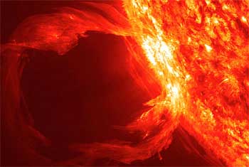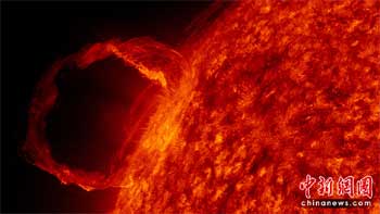 2010年4月22日消息,日前美国宇航局通过SDO捕捉到了一组太阳风暴的画面,这组画面清晰的显示了巨大的“风眼”在太阳表面肆虐,并且随时可能脱离太阳的束缚,根据美国宇航局理查德费舍尔主任的介绍,一旦风暴脱离太阳是束缚,对地球的卫星通讯和电网将产生影响,甚至是极大的破坏性。