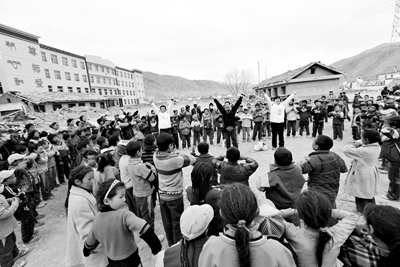 废墟中央是原玉树第三完小学的操场,而上课的学生也就是原先这所小学的在读学生。孩子们在志愿者的带领下,围成了从小到大四个圈,几名志愿者在最中央的圈内,带领孩子们一起唱歌、跳舞、做游戏,原先计划一小时的课因为孩子们的热情,一直延续了两个半小时。记者了解到,这些仁爱慈善基金会的志愿者震后第二天便从北京飞来,与当地30多名志愿者一起,结合自己以往在灾区心理治疗的经验,编写了灾后“快乐课”的内容。他们与玉树当地教育部门联系,获得了教育部门的支持,使得学校的第一堂课如期开始。