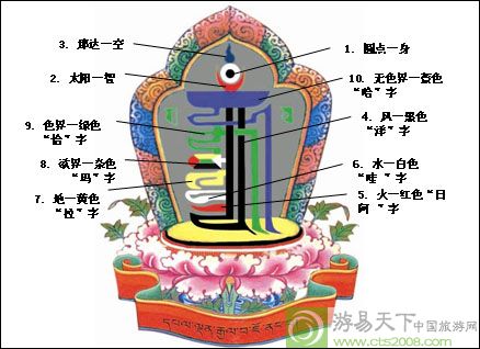 1 )身:在十相自在图中用圆点表示;2 )智:用半月形太阳表示;3 )空:是自明点至洋字的九个字之自性所归之阿字的本性,用三弯曲那达表示;4 )洋字表风;5 )日/阿字表火;6 )哇字表水; 7 )拉字表坚固地界;8 )玛字表示器世间;9 )恰字表示有情;10 )哈字表示天界。