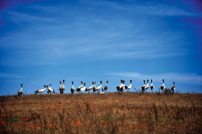 蓝天白云下,受到庇护的黑颈鹤在红土地上悠闲地享受阳光