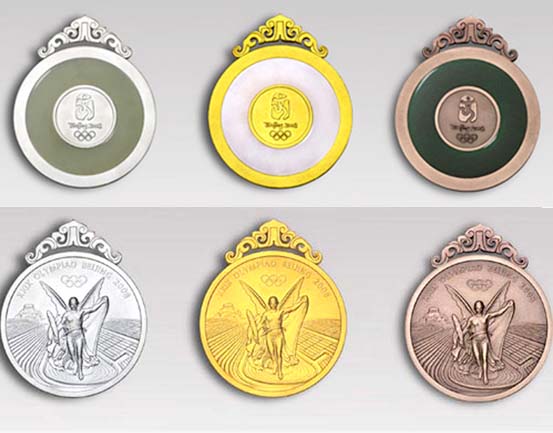 从设计图片上可以看到,三块奖牌正面采用国际奥委会规定的图案,背面分别镶嵌白玉、青白玉和青玉,正中的金属图形镌刻着北京奥运会会徽。