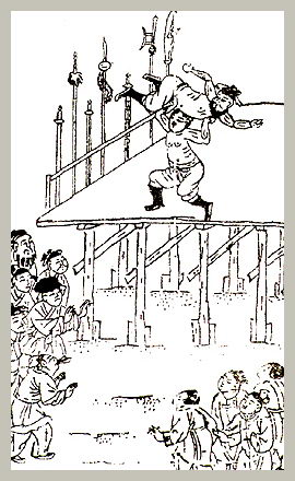 宋代的相扑运动开展得比唐代还要普及,在民间出现了相扑擂台赛。关于北宋时期举行相扑擂台赛的情形,《水浒传》第七十四回中的描绘可作为一种参考。当时,擂台赛在山东泰安城的岱庙中举行,比赛双方一为梁山好汉燕青,一为号称擎天柱的相扑高手任原。我们在此引述其中最为精彩的一段描述:“这个相扑,一来一往,最要说得分明,说明迟,那时疾,正如空中星移电掣相似,些儿迟慢不得。当时燕青做一块蹲在右边,任原先在左边立个门户……看看逼将入来,虚将左脚卖个破绽。燕青叫一声:‘不要来!’任原却待奔他,被燕青去任原左胁下穿将过去。任原性起,急转身又来拿燕青,被燕青虚跃一跃,又在右胁下钻过去。大汉转身终是不便,三换换得脚步乱了。燕青却将人去,用右手扭住任原,探左手插入任原交裆,用肩胛顶住他胸脯,把任原直托将起来,头重脚轻,借力便旋四五旋,旋到献台边,叫一声:‘下去!’把任原头在下,脚在上,直撺下献台来。这一扑,名唤做鹁鸽旋。数万的香官看了,齐声喝彩。”